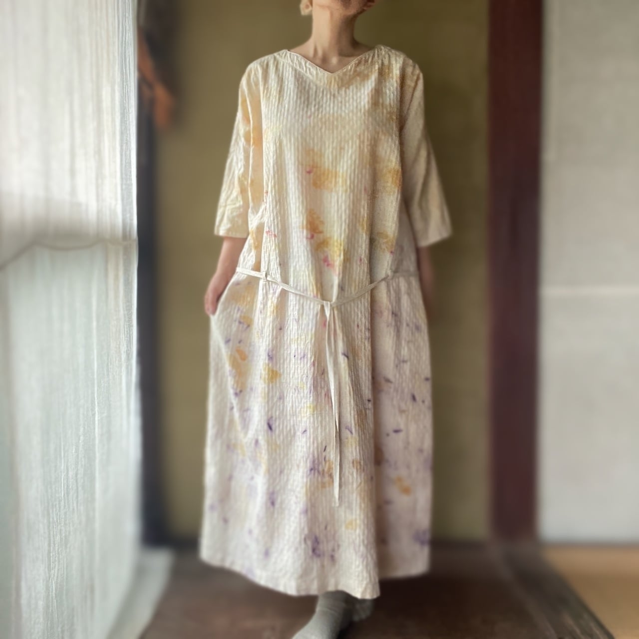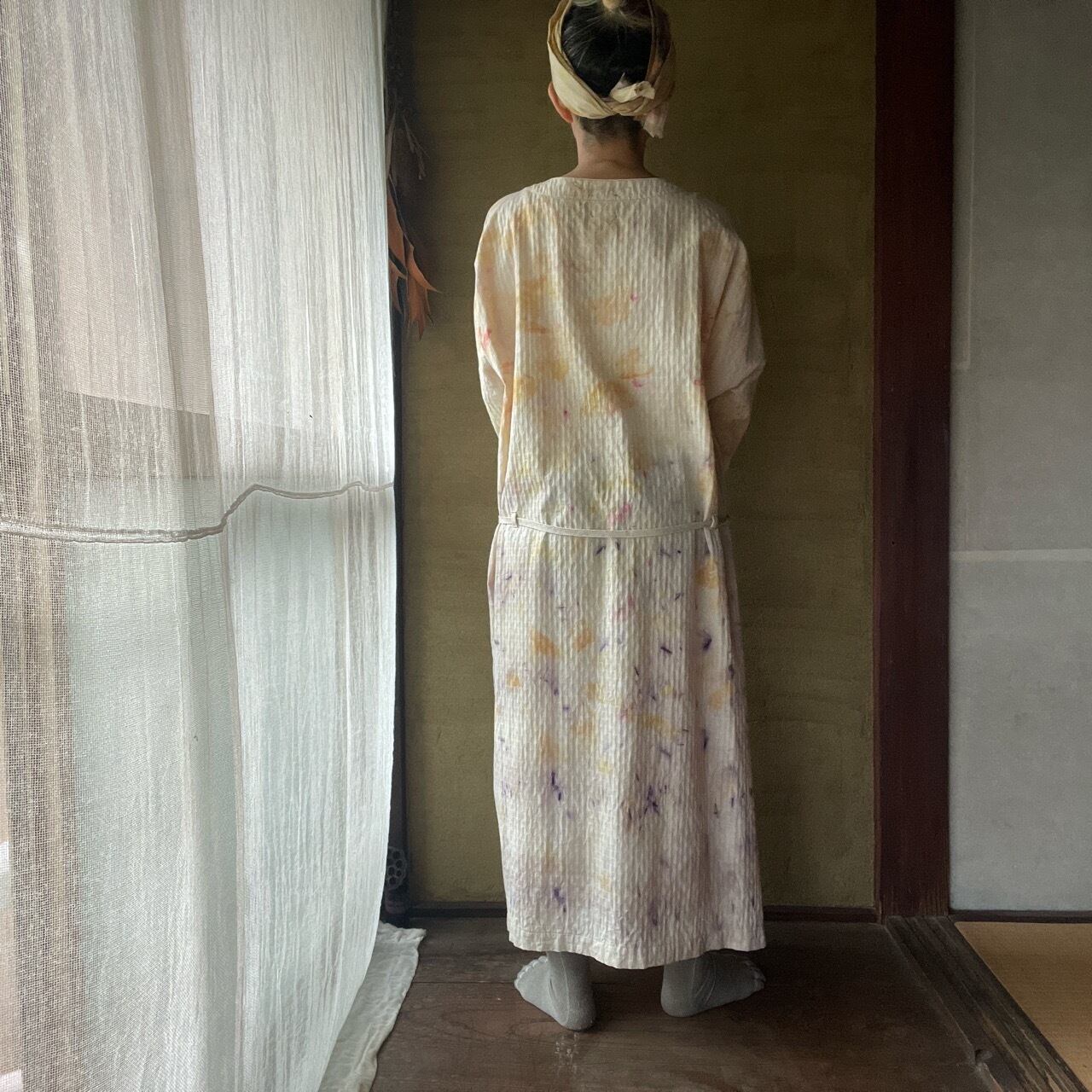 優しく柔らかなワッフル織りコットン 生地を草木染めし、幅広くゆったり着れる、5分袖ワンピースに仕立てました。